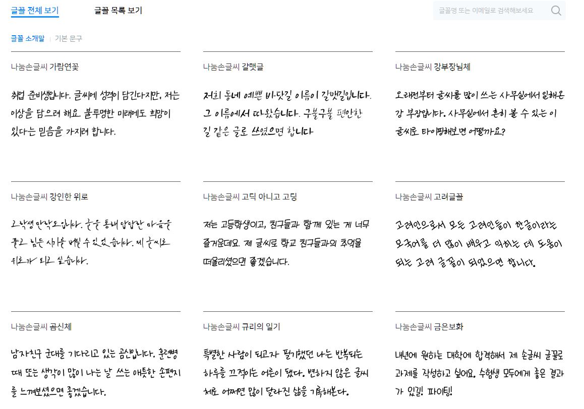 한글날 손글씨 공모전에서 나온 폰트들로 기업 및 단체, 개인 누구나 무료로 사용 가능한 109가지의 폰트들 입니다.