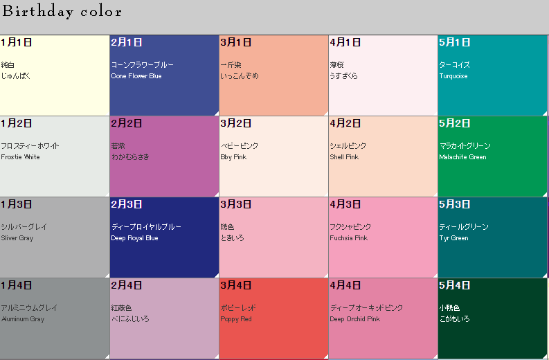 의미를 둘때 자주 사용하는 탄생석, 탄생화, 탄생목 처럼 사용할 수 있는 생일 컬러 입니다.