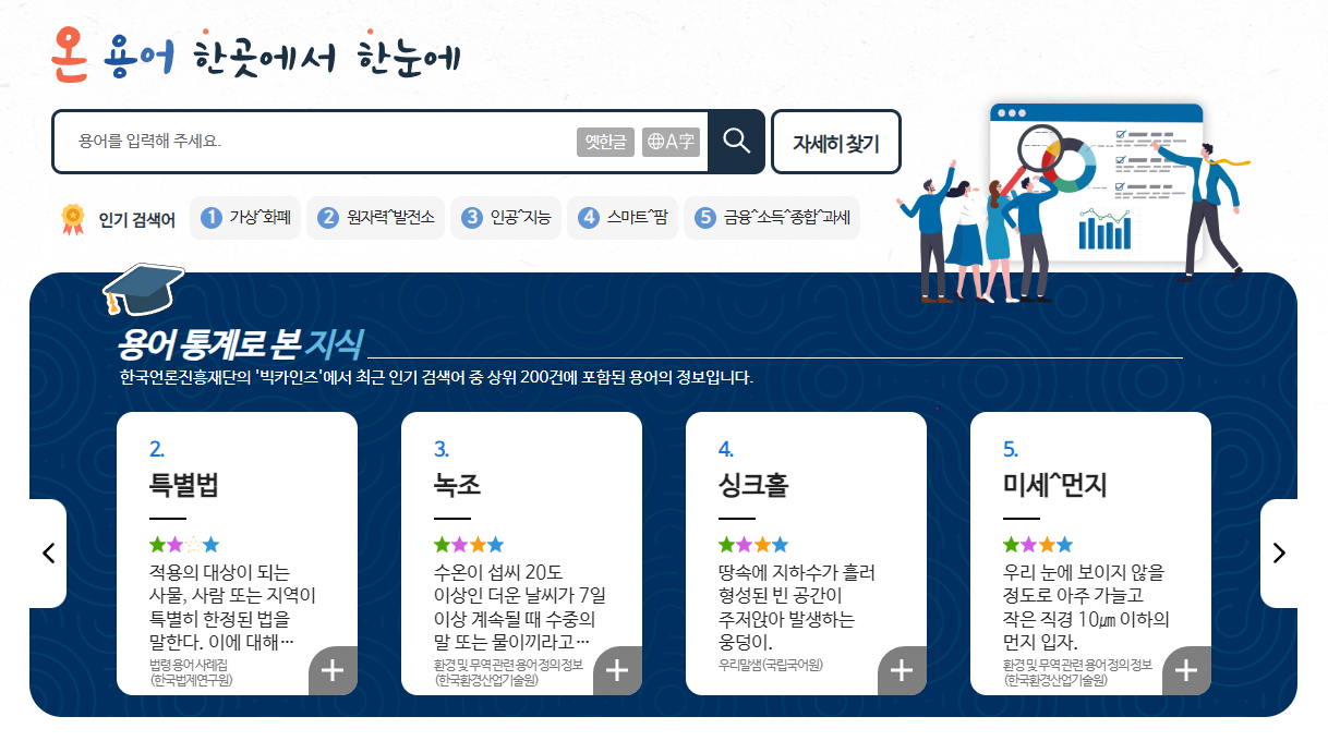 하지만 창작자는 전문가가 아니기에 그런 용어를 모를 때가 있습니다. 그럴때 사용할 수 있는 용어 검색 사이트이며, 국가에서 공식으로 운영하는 사이트라 신용할 수 있는 정보들입니다.