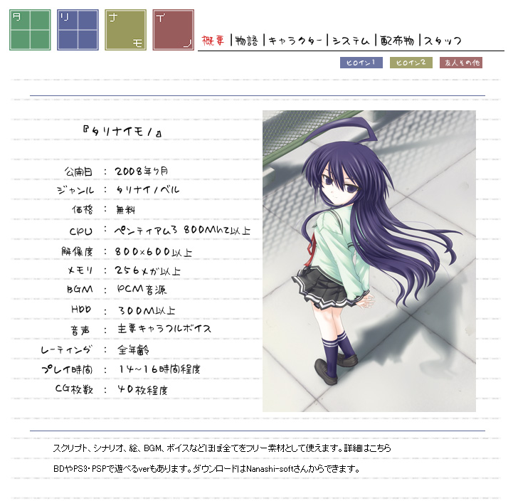 시나리오, 그림, BGM, 음성 등 대부분이 프리소스로 전환되어 배포되고 있는 게임 タリナイモノ 입니다.